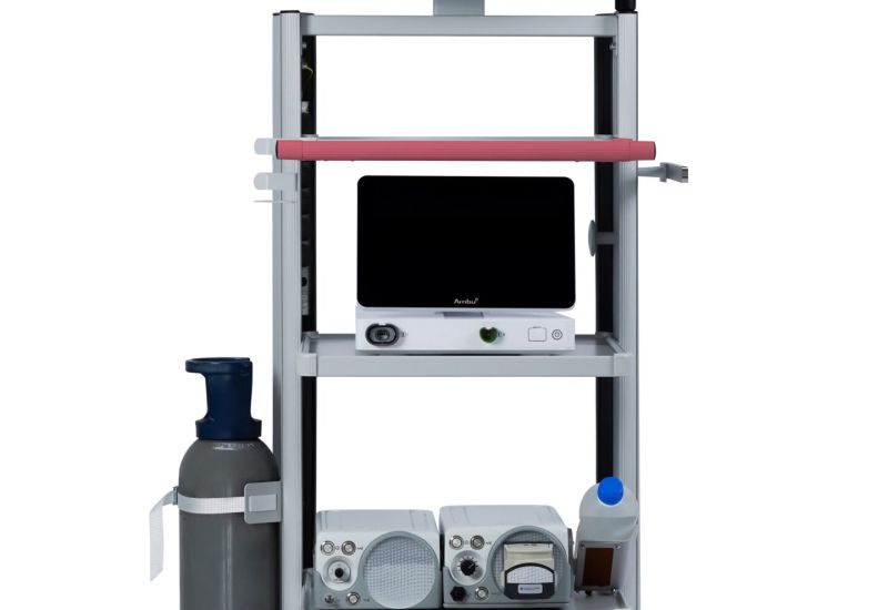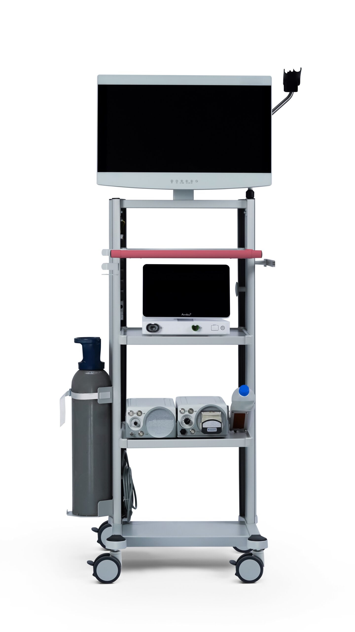 Większy i bardziej pojemny model przeznaczony do intensywnie użytkowanych pracowni endoskopowych, takich jak cystoskopia, gastroskopia czy kolonoskopia. Trzy półki, uchwyty na butle CO₂ i sterylne butelki z wodą zwiększają funkcjonalność, zapewniając wygodę użytkowania i optymalną organizację sprzętu medycznego.